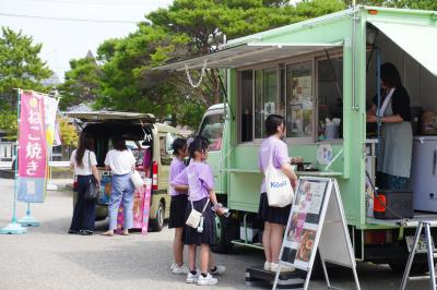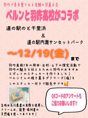 羽咋の老舗洋菓子店・ベルン様のご協力のもと、人気焼き菓子「ダクワーズ(塩)」に、羽咋市の名所の写真をデザインしたオリジナルステッカーを同封し、羽咋市と内灘町の道の駅で期間限定販売を行っています。