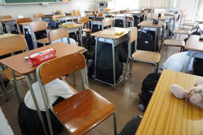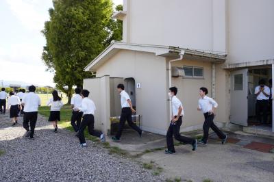 今回は教室棟の階段2か所が地震の被害により通行不可となる抜き打ち訓練で、予期せぬ状況下でも安全な避難経路を選択し他クラスと連携してグラウンドまで避難できるかが試されました。