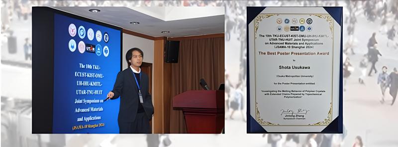 2020年に羽咋高校を卒業し、現在、大阪公立大学大学院工学研究科 物質化学生命系専攻 応用化学分野(合成高分子化学研究グループ)博士前期課程1年の薄川翔太さんが、令和6年10月31日に華東理工大学(上海)で開催されたJSAMA-10 Shanghai 2024において、The Best Poster Presentation Awardを受賞しました。