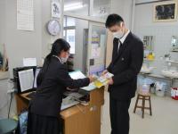 図書カウンター当番(3年生から2年生へと)が交代しました。9月末まで3年生がおこなっていたお昼休みのカウンター当番を、10月からは2年生図書委員に交代しました。「皆さん“読書の秋”です。新しい本も入りました。本を借りに来て下さいね。」11月は1年生の図書委員がカウンター当番を務めます。