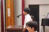 全校応援後、井上校長から「両部とも悔いを残さないよう一生懸命誠実に、仲間の期待に応え頑張って下さい。応援しています。」と激励がありました。また、「今出せる力をめいっぱい出して、思い切り楽しんできて下さい。」とPTAの方々からの激励文が披露され、最後に生徒を代表し生徒会長の綱本くんから激励の言葉がありました。
