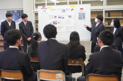5限目の1年探究中間発表会は、総合的な探究の時間で地域課題の解決に取り組んできたこれまでの成果について発表しました。