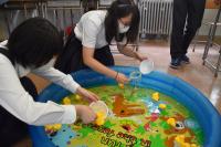 生徒会企画の「先生当てクイズ」では、幼い頃の先生方の写真に「可愛い~~」の声が連発、また「豆つかみ大会」「イントロクイズ」「3人綱引き」では接戦が繰り広げられて、とても盛り上がっていました。