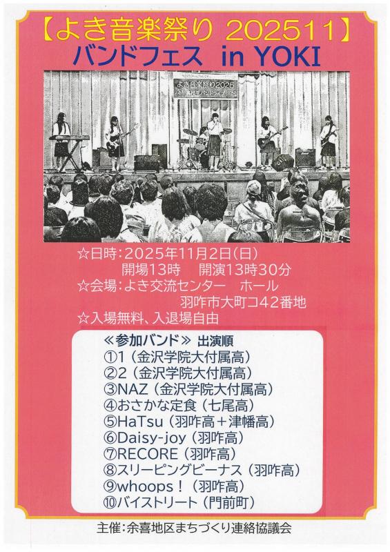 11月2日(日)に羽咋市余喜公民館のホールにてよき音楽祭が開催され、県内の軽音楽のバンドや大人の方のバンドとも一緒に音楽祭に参加する予定です。日程など以下にポスターを掲載します。興味がある方は、見に来てください!