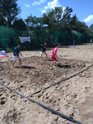 次に9月23日に千里浜のビーチバレー専用コートで行われた「がんばろう能登プロジェクトエアバドミントンin千里浜」に参加した様子です。