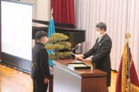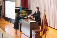学校長より、193名に卒業証書が授与されました。コロナ禍の様々な制限の中にあっても、自分たちで考え、工夫し、色鮮やかな学校生活を創り上げた卒業生でした。学校長が、西郷隆盛が留学する甥に送った漢詩の一節「雪に耐えて梅花麗しく、霜を経て楓葉丹し」を贈り、「困難な時も前向きに乗り越えてきた皆さん、これからも多くの出会いを重ね、知識を身に付け、考える力を磨き、仲間と協力し、新たな課題に向き合い、平和な社会・未来を築いていってほしい。」と式辞を話されました。三ヶ年皆勤賞受領者は32名でした。卒業記念品として『音響設備一式』が贈呈されました。大切に使っていきます。ありがとうございました。式後、本校シンボル「杜の鐘」の鐘の音を合図に退場し、各教室に入り、最後のホームルームを行いました。皆さん、どうぞお元気で、ご活躍下さい。