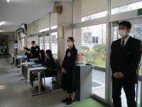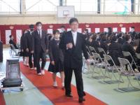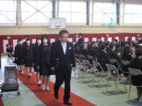 式は、開式の辞、国歌斉唱、校歌斉唱とはじまり、学校長より156名の3年生に卒業証書が授与されました。その後、16名に三ヶ年皆勤賞が授与されました。学校長より式辞、同窓会会長、PTA会長より祝辞、卒業記念品贈呈、在校生送辞、卒業生答辞、蛍の光斉唱と厳かに行われ、閉式の辞後、杜の鐘を合図に卒業生は退場しました。式の後、卒業生は各クラスで最後のホームルームを行いました。同窓会より、旅立ちを祝う花「エアリーフローラ(石川県産)」(花言葉は「希望」)が贈られ、担任より卒業生一人一人に渡されました。