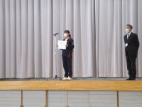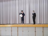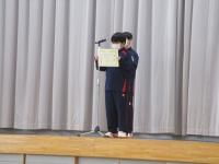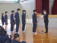令和5年3月17日(金)、全国選抜大会壮行式後に、令和4年度 表彰伝達式・図書多読者表彰を行いました。陸上競技部、柔道部、剣道部、吹奏楽部、書初め入賞者から入賞報告がありました。教頭先生より「3つの力(気力・技術力・体力)が大事。1番大切な気力を今後の練習で鍛え、さらなる高みを目指してほしい。」と講評がありました。引き続き図書多読者表彰があり、10名の生徒が表彰されました。