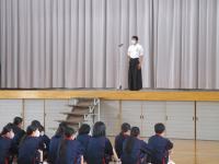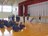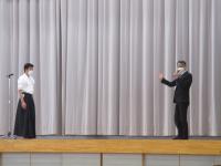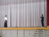 令和5年3月17日(金)、後期校内球技大会後に、令和4年度全国選抜大会壮行式を行いました。3月25日・26日に、兵庫県伊丹市の伊丹スポーツセンターで開催される「令和4年度 全国高等学校なぎなた選抜大会(男子個人)」に2年生の中村さんが出場します。壮行式では、横田教頭より「全国選抜に出場することは、名誉なことであり喜ばしいこと。重圧に負けることなく強い気持ちで頑張って来てほしい。」と激励の言葉がありました。そのあと、生徒会長激励の言葉や、生徒応援、選手挨拶がありました。