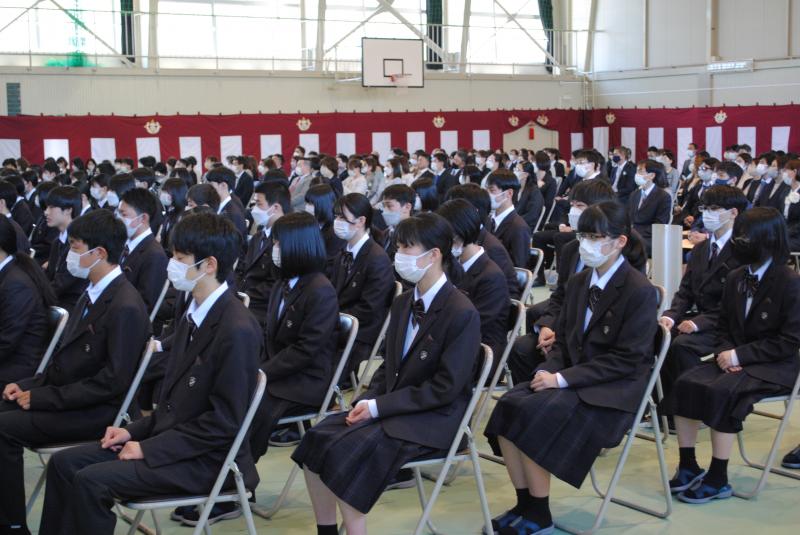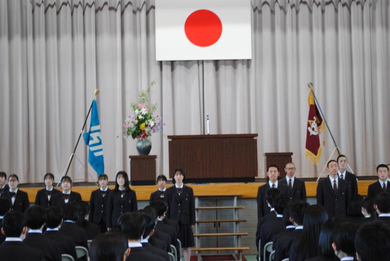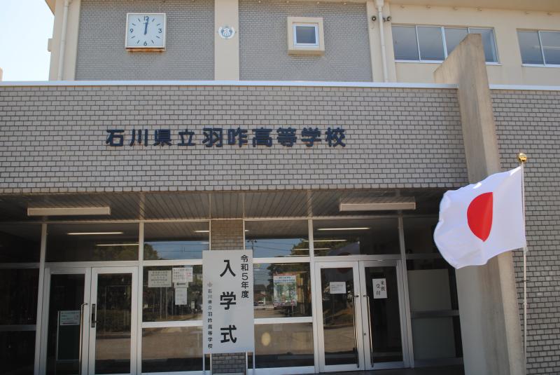 新入生は緊張した面持ちながら、保護者や来賓の方々に見守られ堂々と入場し、羽咋高校生としての第一歩を踏み出しました。今年度は、野球部員と吹奏楽部による校歌斉唱が行われ、後輩となる新1年生を温かく迎え入れてくれました。その後、井上政人校長から入学許可を受け、校長式辞、新入生宣誓、生徒会長から歓迎の言葉がありました。