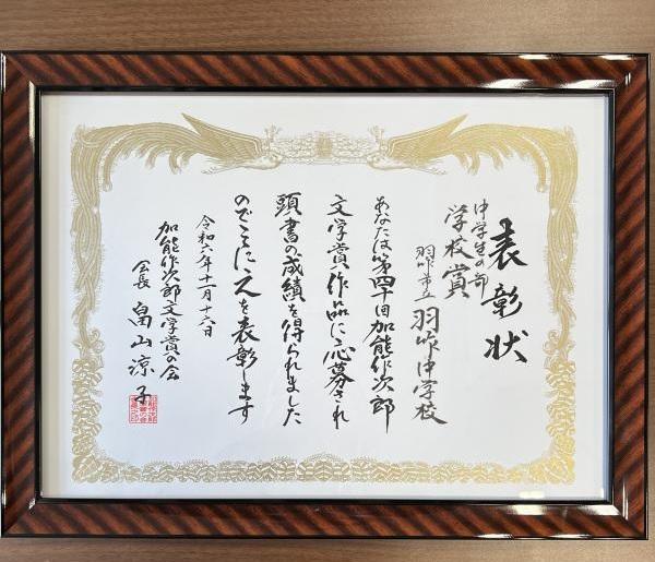 二人の入賞者と共に、今回、学校賞をいただいたことを契機として、一層表現することの大切さを理解し、全校で取組を進めていきたいと思います。