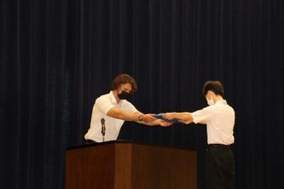 昨年度同様、新型コロナウイルス感染症対策のため3年生と保護者の方々が体育館に、2年生は教室でオンライン画像を視聴しての歓迎となりました。在校生を代表して本多正樹さんが歓迎の言葉を述べました。また、新入生を代表して磯見さくらさんが、「一人一人が輝く中学校生活を送ることができるよう友達と歩んでいく」ことを力強く誓ってくれました。