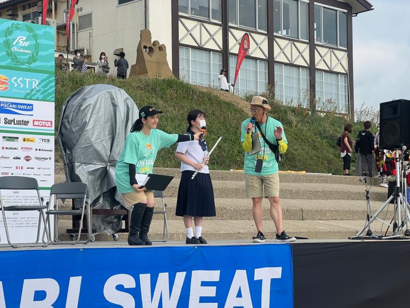 20日(土)に本校吹奏楽部が、SSTRのゴール地点にある千里浜レストハウス横に特設されたステージで、5曲を披露しました。演奏後、3年生の折田紗菜さんが、歓迎の思いを込めて演奏したとのメッセージを伝えました。