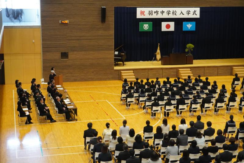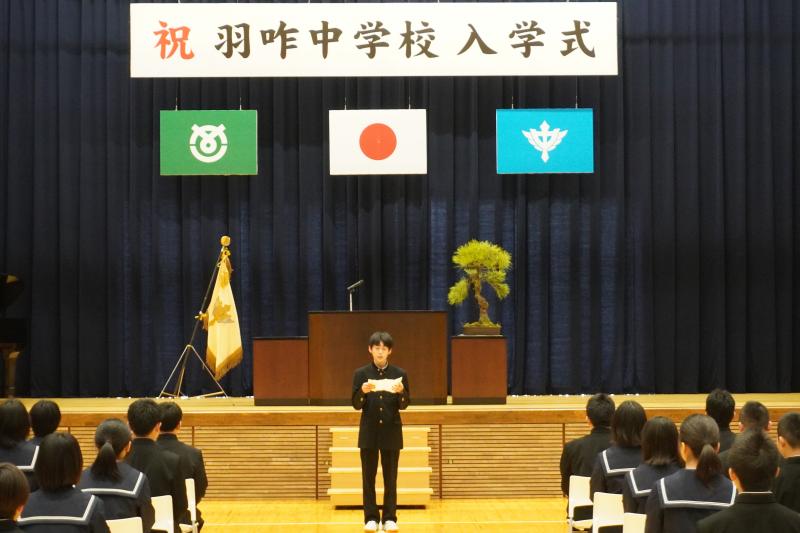 式に際して、在校生代表の東海碧月さんが、「今日から私たちと同じ仲間です。伝統ある羽咋中学校の一員として、笑顔と思いやりを忘れず、楽しい学校となるよう力を合わせていきましょう。」と歓迎の言葉を述べました。また、新入生を代表して北出岳朋さんが、「羽咋中の生徒としてのプライドと責任感をもち、何事にも積極的にチャレンジし、充実した中学校生活を送りたい」と力強く宣誓してくれました。