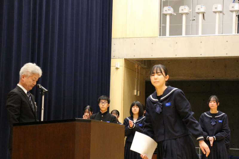 在校生を代表して村田 幸さんが「今日から羽咋中学校でも共に学び、共に成長する仲間です。1日も早く中学校生活に慣れるよう、在校生一同応援しています」と歓迎の言葉を述べました。また、新入生を代表して山岸由菜さんが、「今日の喜びを忘れることなく、羽咋中生の誇りをもち、実りある学校生活を送る」ことを力強く誓ってくれました。