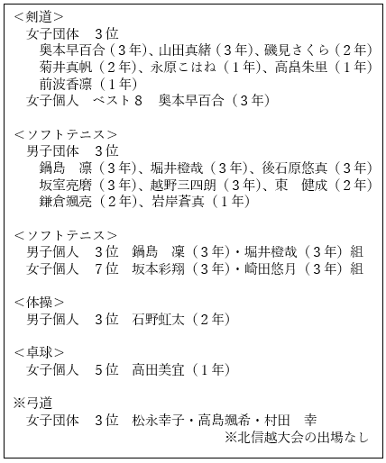 8月1日(火)から本県を会場にして、熱戦が繰り広げられる北信越大会が始まります。本校の北信越大会に出場する選手団は次のとおりです。引き続き応援をお願いします。
