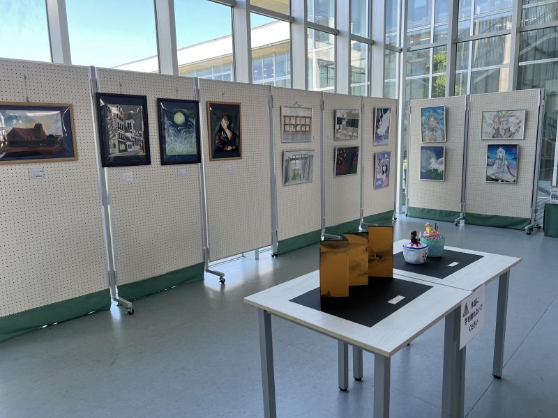 一方、美術部においては、先週18日(火)より今週27日(木)まで、本校生徒玄関にこれまでに制作した作品を展示しています。この展覧会をもって、3年生は引退となります。明るい本校生徒玄関が一層素敵な空間へと変わりました。保護者の皆様方には、通知表渡しの際には、ぜひご覧ください。