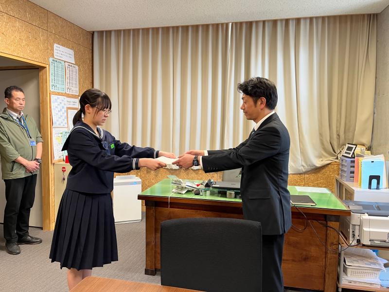 2日(木)、穴水中学校の中越教頭先生が来校され、能登半島地震のお見舞金贈呈式を行うことができました。