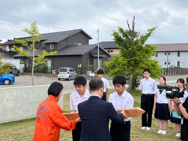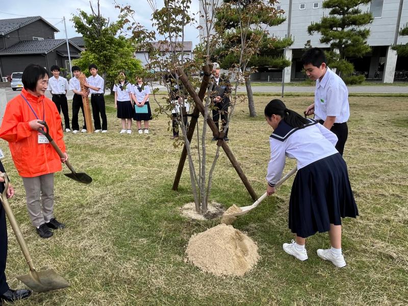 今回、贈呈していただいたのは、「ヤマボウシ」です。登下校時に目にするこの「ヤマボウシ」の花言葉は「友情」です。学校にはぴったりのこの樹の成長とともに、着実に生徒たちの「友情や思いやりの心」をもつ人権意識の高い生徒・教職員となるよう努力していきたいと思います。ありがとうございました。