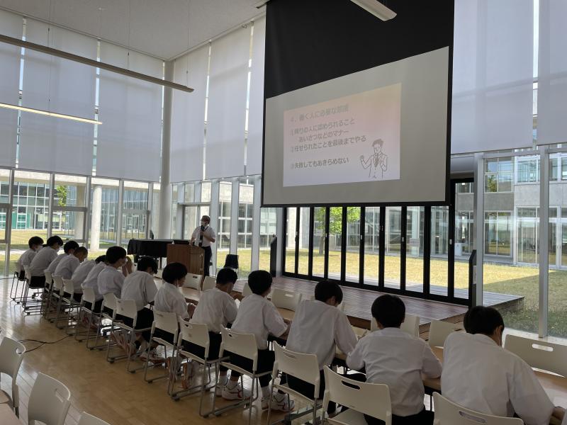 職場体験学習に参加する2年生を対象に、お話を聞く機会がありました。