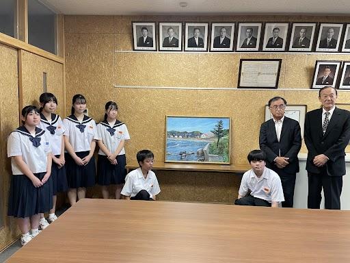 「等伯と柴垣海岸」と題した作品は、縦約70cm×横約95cmのサイズで、柴垣海岸を描いた素敵な風景画でした。長谷川等伯と所縁(ゆかり)のあった妙成寺の近く、柴垣海岸をモチーフに描かれた作品とのことです。今後は、1階廊下に展示したいと思います。ありがとうございました。