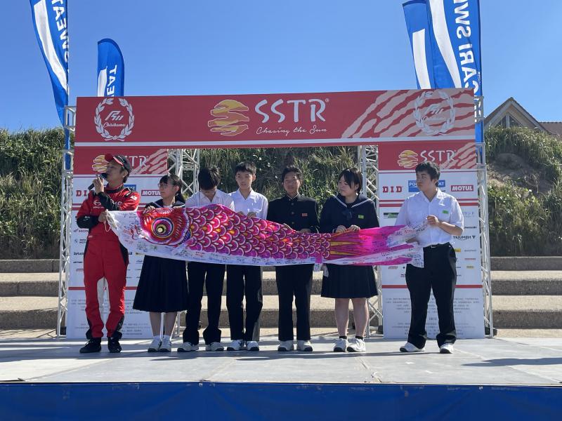 14日(祝)、千里浜SSTRのゴール地点にあるステージで、鯉のぼりに書いた応援メッセージをダカールラリーに参戦する「日野チームスガワラ」のドライバー菅原さんに手渡しました。