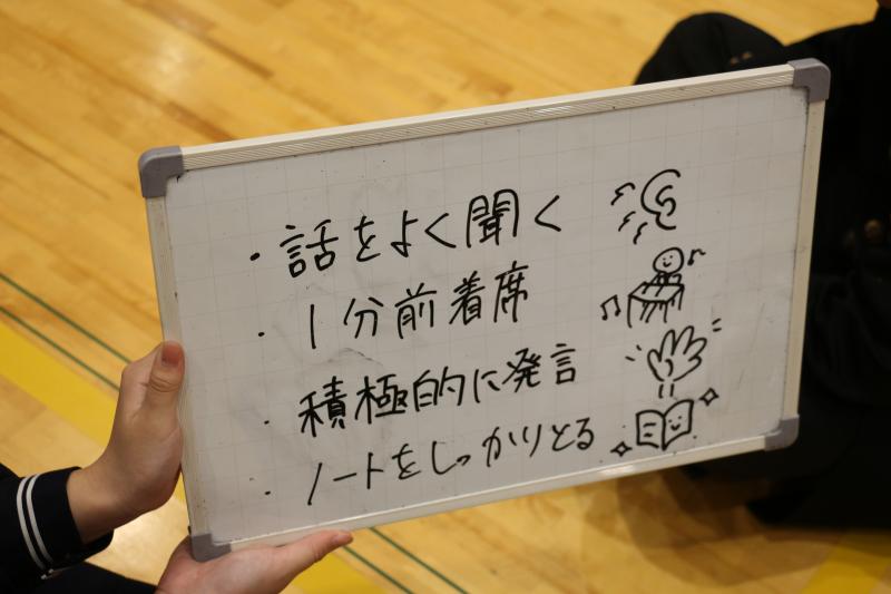 今回は、「学級の学習の雰囲気を一歩高めるための工夫」について、全校生徒で考えました。小グループの話し合いから、意見交流を学級全体にまで広げ、集約した意見を各学級の代議員が全校生徒に向けて発信し、共有することができました。