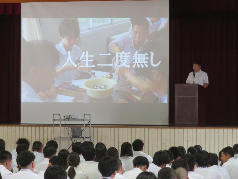 ふるさとに誇りと愛着を持ち、確かな学力を身につけた個性や創造性に富む人間、モラルを重んじ責任感を持ち、他者を思いやる心豊かな人間、健康や体力の増進に努め、逞しさと活力を持って行動する人間の育成のため、日々の授業や学校行事、資格・検定の取得や、部活動、地域との連携に取り組みます。