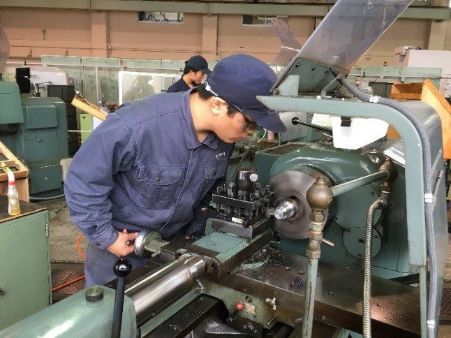 旋盤を使い、加工法や精密測定の方法を学ぶ |
