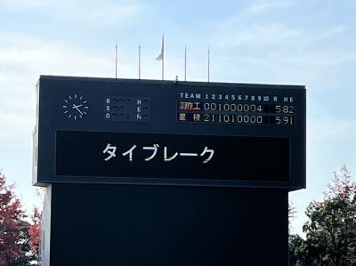 7回裏に4点差を追いつき、9回を終えて5−5の同点、延長タイブレークとなりました。