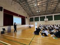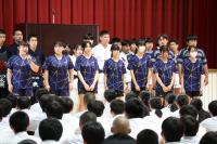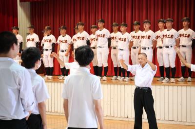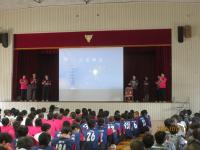 12月3日(水)に壮行式が行われました。ジャパンマイコンカーラリー2026全国大会に出場するコンピューター部の31H吉野さん、嶋田さん、片岸さんに全校生徒・職員でエールを送りました。