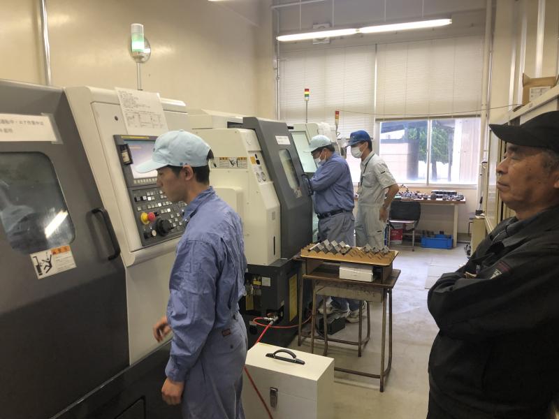 普通旋盤には1名、NC旋盤には4名の生徒が実技の練習を行っています。