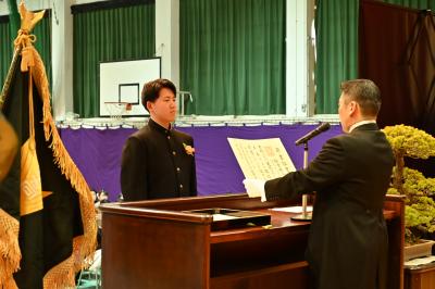 次に本校教職員の思いを代弁します。今日、本校を巣立つ皆さんの立派な姿を見て、とても誇らしく思い、教員冥利に尽きる思いです。私達教職員は、皆さんの将来を豊かで明るいものにしたいと願い、皆さんと向き合ってきました。時には、随分とうるさい存在であったかもしれません。しかし、どうか、担任の先生をはじめ私達教職員のことを、心に刻んでください。卒業してからは、共に生きる人生の友として、工業健児らしく挨拶をしてください。