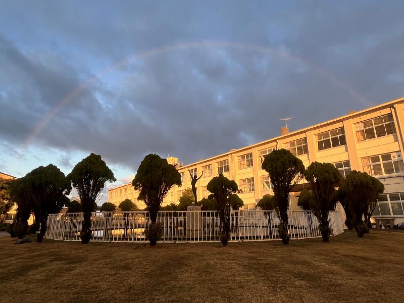 若竹の像と本校校舎、そのバックに虹の大円。本校は絵になりますね!