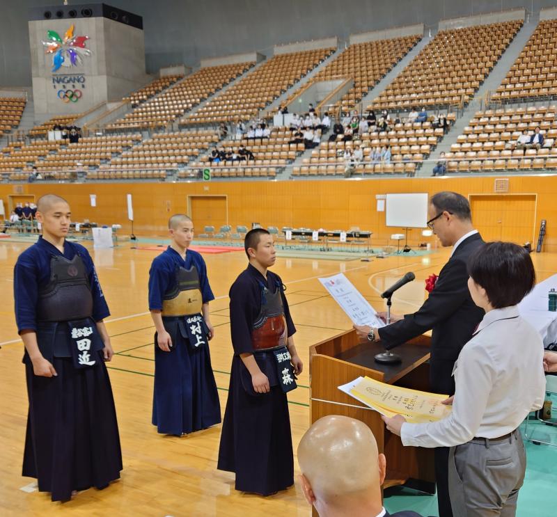6日は個人準々決勝が行われ、九州学院(熊本)の森選手に対して先行のドを決めましたが相手にも取られ、延長戦30分近くの激闘を繰り広げましたが個人ベスト8になりました。本校森主将は優秀選手に選出され、表彰式で受賞されました。暑くて長い日程の中選手たちは普段の練習が功を奏し体調を崩すことなく頑張り続けました。来年はこの雪辱を晴らすべく更なる健闘を誓います。応援、ご支援していただいた卒業生、後援者、保護者、職員、関係者の皆様に感謝するとともに更なる飛躍を実現するべく稽古に励みます。ありがとうございました。