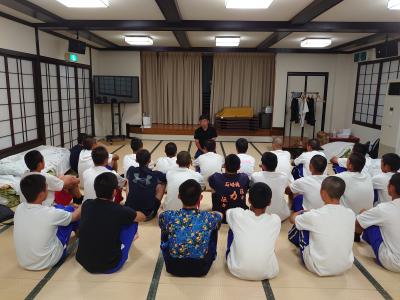 夏休み中に参加した、岩手県陸前高田市での東日本大震災被災地支援事業の高野連報告を、金沢市の石川県青少年総合研修センターで行いました。