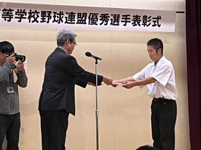 能登地区の優秀選手に羽咋工業の山田優太郎(3年)が選ばれ、高野連副会長の本校 中越校長から表彰状が手渡されました。