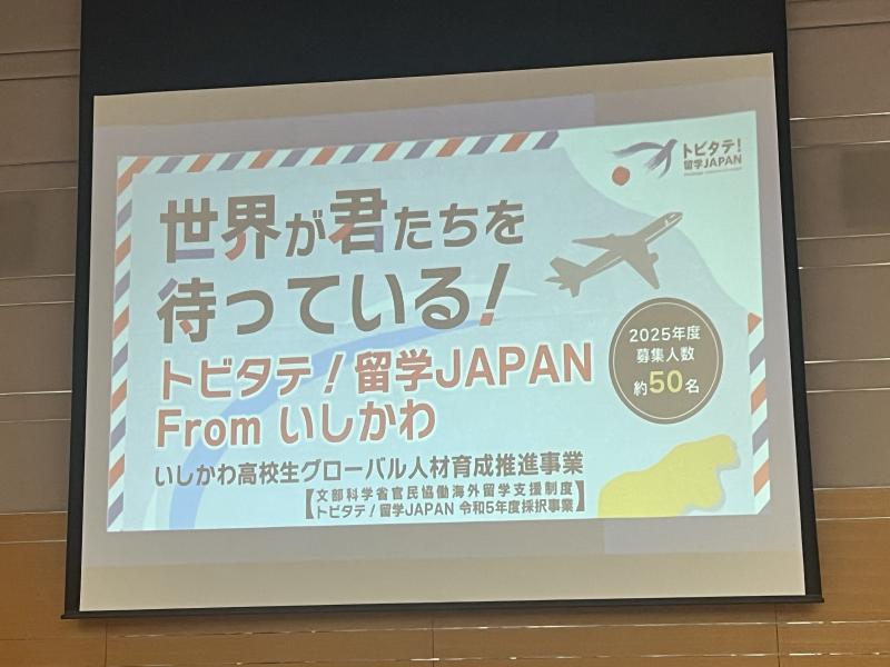 この発表はいしかわ高校生グローバル人材育成推進事業 トビタテ!留学JAPANの企画で、県内の高校生約40名が海外に2週間から4週間留学し、現地で語学研修、探究活動、アンバサダー活動の成果を公開するものです。