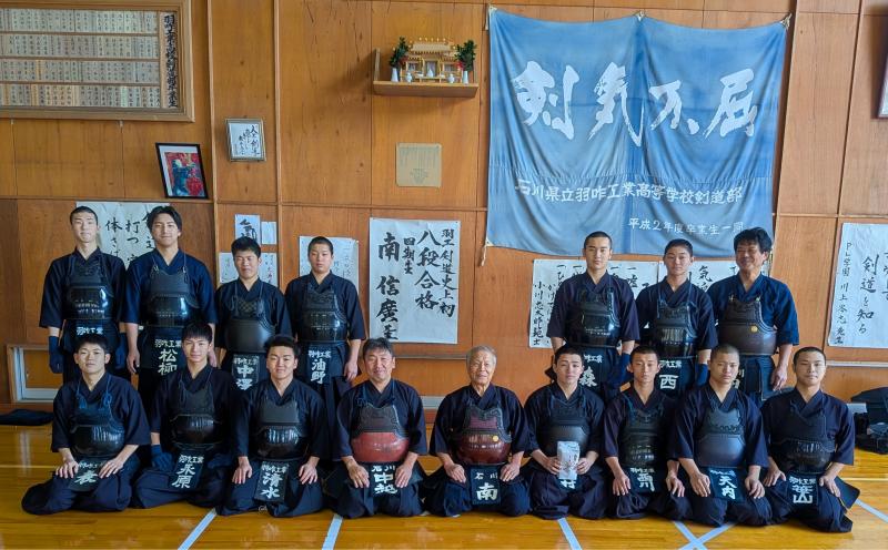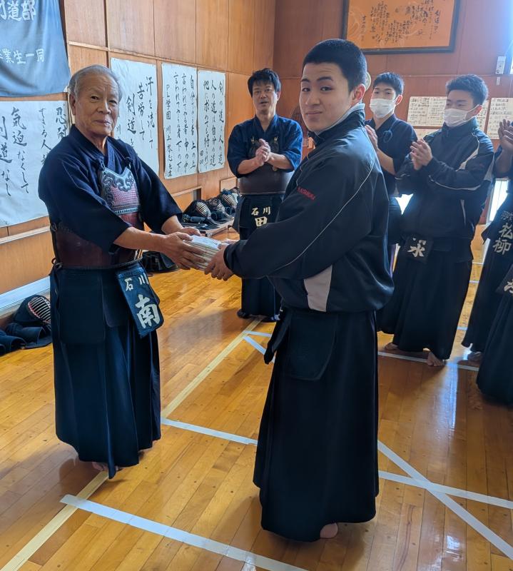 雪が降り積もる中、保護者の皆様に除雪をしていただき、ありがとうございました。今年は稽古に先立ち、昨年剣道界最高段の八段になられた、一般財団法人 石川県剣道連盟 会長 南 信廣先輩(4回生 電気科卒)が生徒に記念品を贈呈いたしました。ありがとうございます。