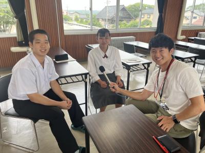 本校生徒代表として、33Hの松本琉之介君と平野愛華さんがインタビューに答えました。