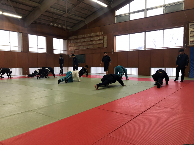 悪天によってグランドがなかなか使えないことが多い冬季は、柔道場でマット運動を行ったり、体育館で基礎的なボール練習、トレーニング場での基礎筋力を高める練習を行っています。