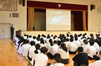 はじめに、この工事を行うことでどのような効果が見込まれるかを石川県中能登土木総合事務所の方から説明していただきました。生徒は今はまだわからないかもしれませんが、3年生になって免許をとって、運転できるようになったら、効果を実感してもらえると思います!