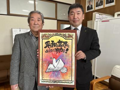 先生は、芸術家として著名であり多くのコンクールで賞をとられています。今回は、羽咋工業高校と羽咋高校の生徒が共に学んでいるこの環境で、何か震災に対して出来ることは無いかを苦心し、この絵を寄贈し、子供達に少しでも元気でいてほしい願いを込めた話をされていました。