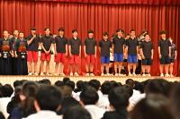 壮行式が行われ、北信越高等学校体育大会に出場する卓球部、ラグビーフットボール部、ヨット部、柔道部、剣道部の選手たちに全校生徒・職員でエールを送りました。