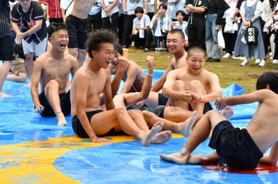 羽工祭2日目はエイトマンのパワーあふれるオープニングライブで始まり、屋外ステージでは、カラオケ決勝、早食い決勝、仮装コンテスト、フリーステージ、ローションカーリング等が行われ、会場はおおいに盛り上がりました。また、模擬店や縁日も大盛況でした。ラストを飾る若旦那ライブで完全燃焼した羽工生たち。最後まで輝いていたみんなの姿が目に焼き付いています。
