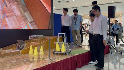 その後、工業高校の研究 ロボット競技のデモンストレーションで、本校31Hの谷口くん 平田くん 松舘くん 寺くん 竹谷くんが作成したロボットを披露しました。