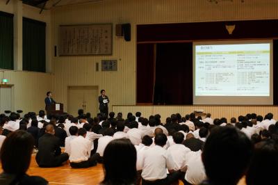 講師のお二人からは、製造業における実情を生徒にわかりやすく、ユーモアも交えて講演していただき、生徒も真剣に聴講していました。それぞれの会社の視点から、大企業・中小企業で働くメリット・デメリットについて、製造業で働く楽しさや可能性について、また製造業のワークバランスの良さなど、現場で働く若者のリアルな声を交え、生徒たちに分かりやすく話されました。生徒にとって、製造業だけではなく多くの選択肢があるものの、どこを選ぶにせよ、その中から「自分の人生で一番大切にしたいものは何か」を考え進路を決めることが重要であると、大切な教訓が得られたと思います。最後の質疑応答でも時間の限り生徒の質問にご回答いただき、参加した生徒、教職員や保護者の方にとって貴重な時間となりました。お話しいただき本当にありがとうございました。