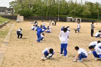 校内清掃の様子。グラウンドと正面玄関前の芝生に分かれて行いました。