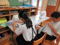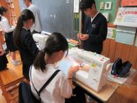 6年 家庭科「生活を豊かに ソーイング」 ミシンを使ってナップザックを作っています。