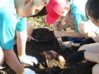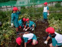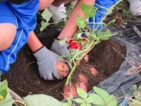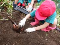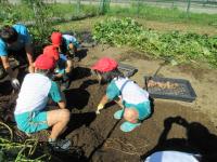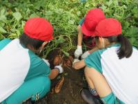 2年生 本日は6月に植えたさつもいもを掘りました。大きいもの、小さいもの、長いもの、まん丸いもの、様々なさつまいもを収穫しました。